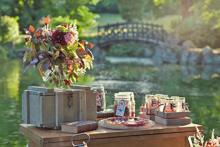 Un shooting d’inspiration à la touche sauvage sophistiquée. Des bonbons mûres et framboises font écho aux bouquets dans lesquels sont piqués des baies sauvages. On retrouve cet esprit authentique à travers une tarte à l’ancienne à la confiture et aux framboises fraiches. Des réglisses et des pralines sont quant à eux présentés dans des bocaux, tandis que des bouteilles de vins sont disposées dans une authentique vieille caisse à vin. Un coffre à munitions du début du vingtième siècle a été restauré pour servir de support et créer des volumes. De vieux livres aux couvertures couleurs bordeaux et camel sont disposés ça et là pour se laisser aller à la rêverie. Comme goodies, ce sont des sablés revisités, qui servent de remerciement aux invités.
